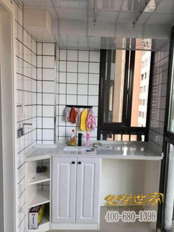 在阳台,我专门做了个地柜可以放些洗漱用品,也能将洗衣机塞进去台,很方便。